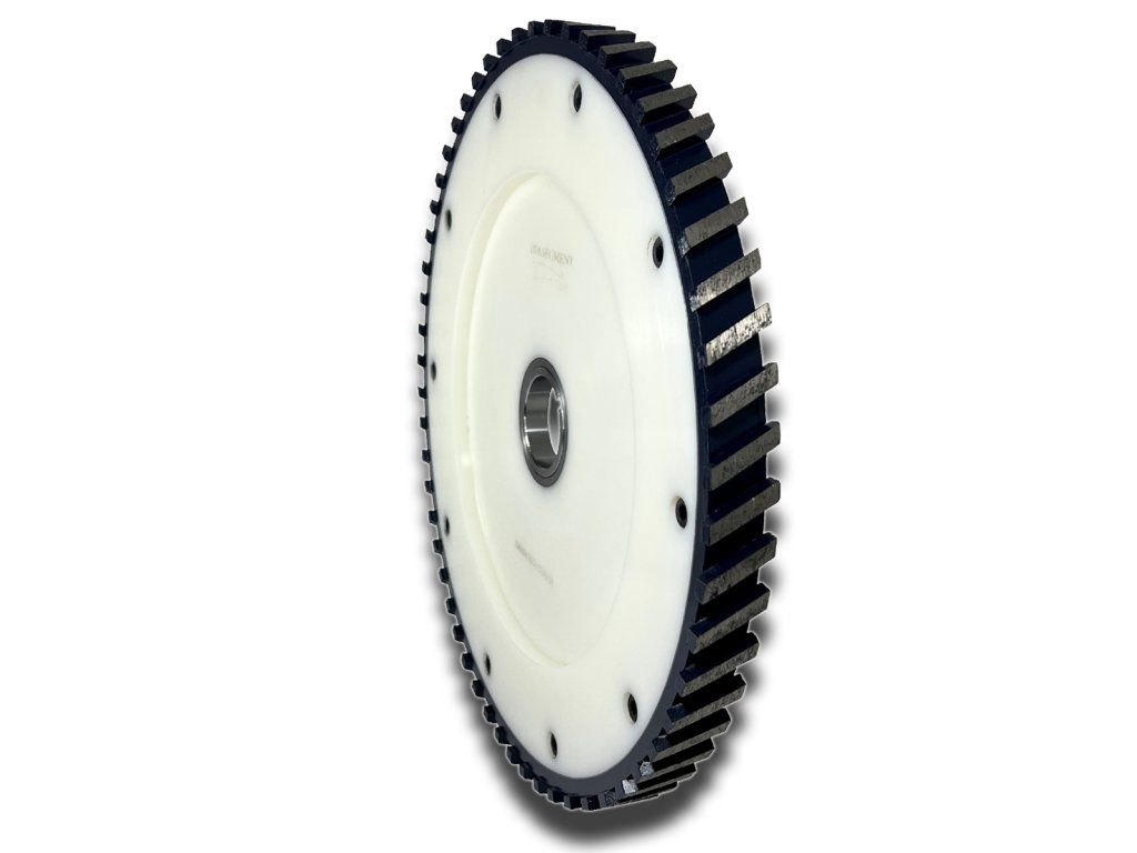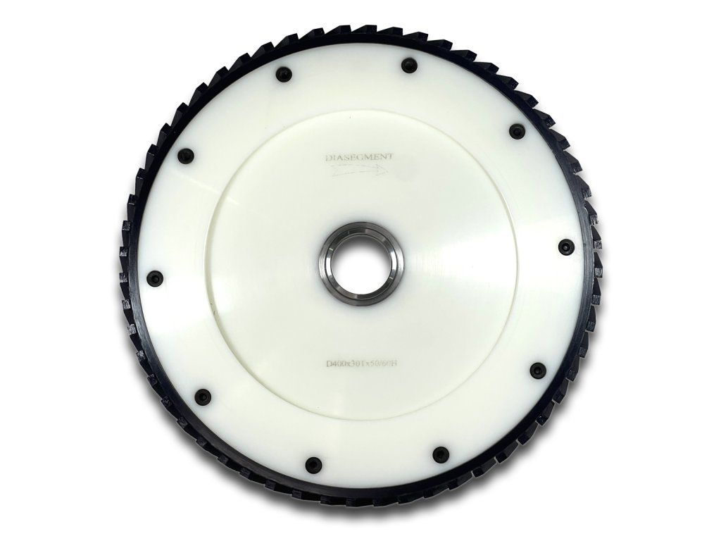 Massaging, formatting or calibrating disc with a segment width of 3 cm. Diameter 400 mm, center hole 60 mm + 50 mm reduction. Tool built for high material removal. Suitable for aligning unevenly cut formats.